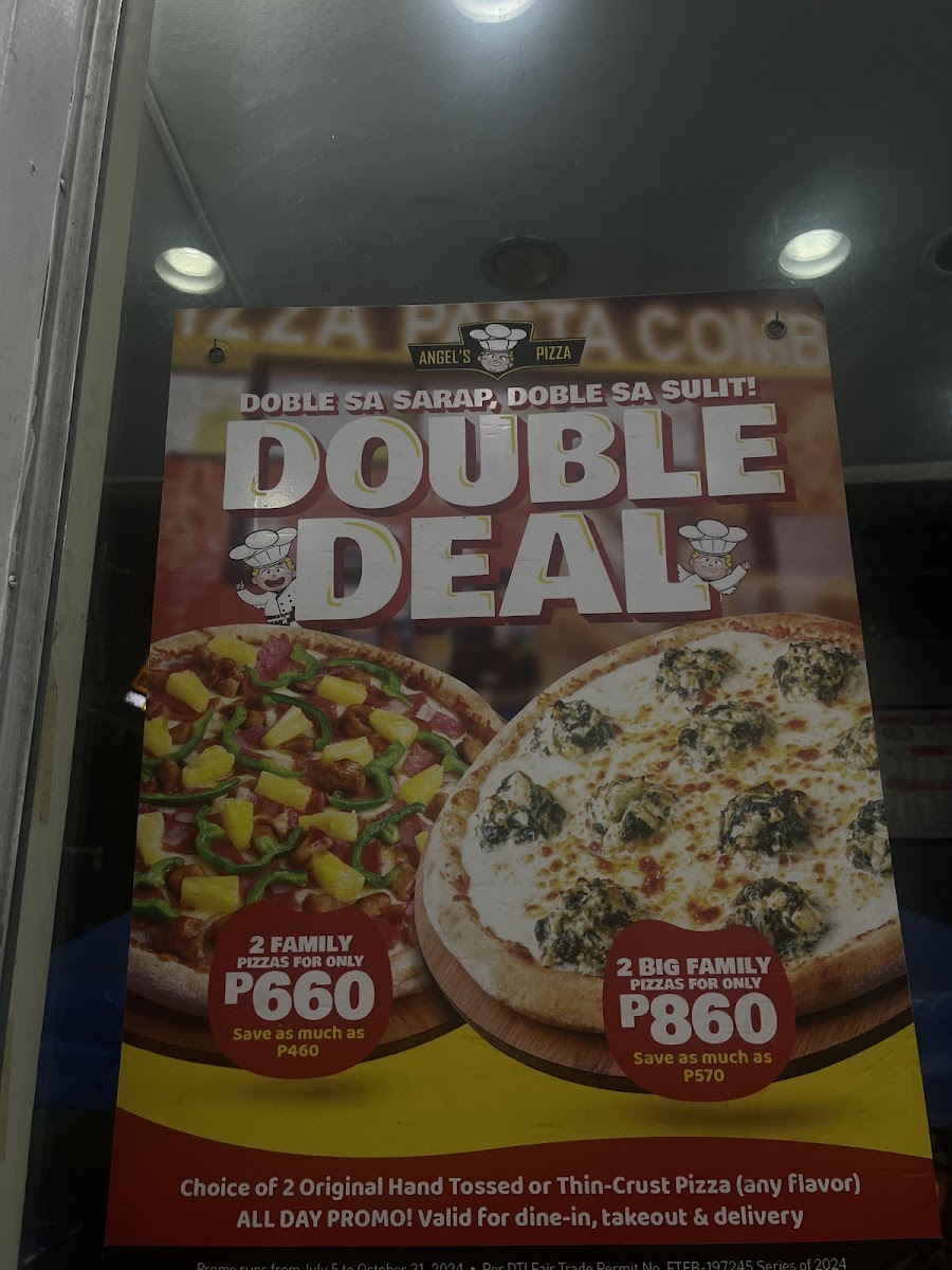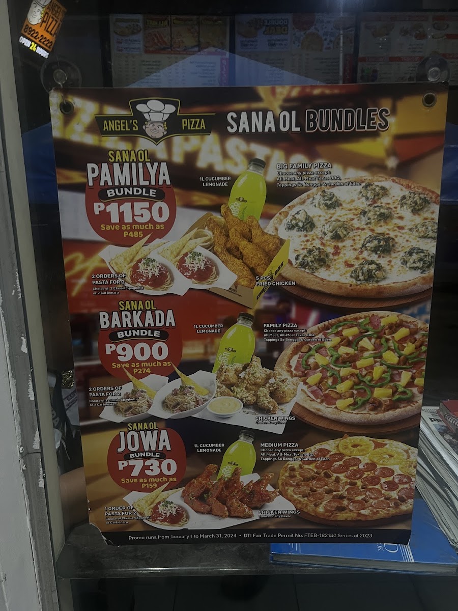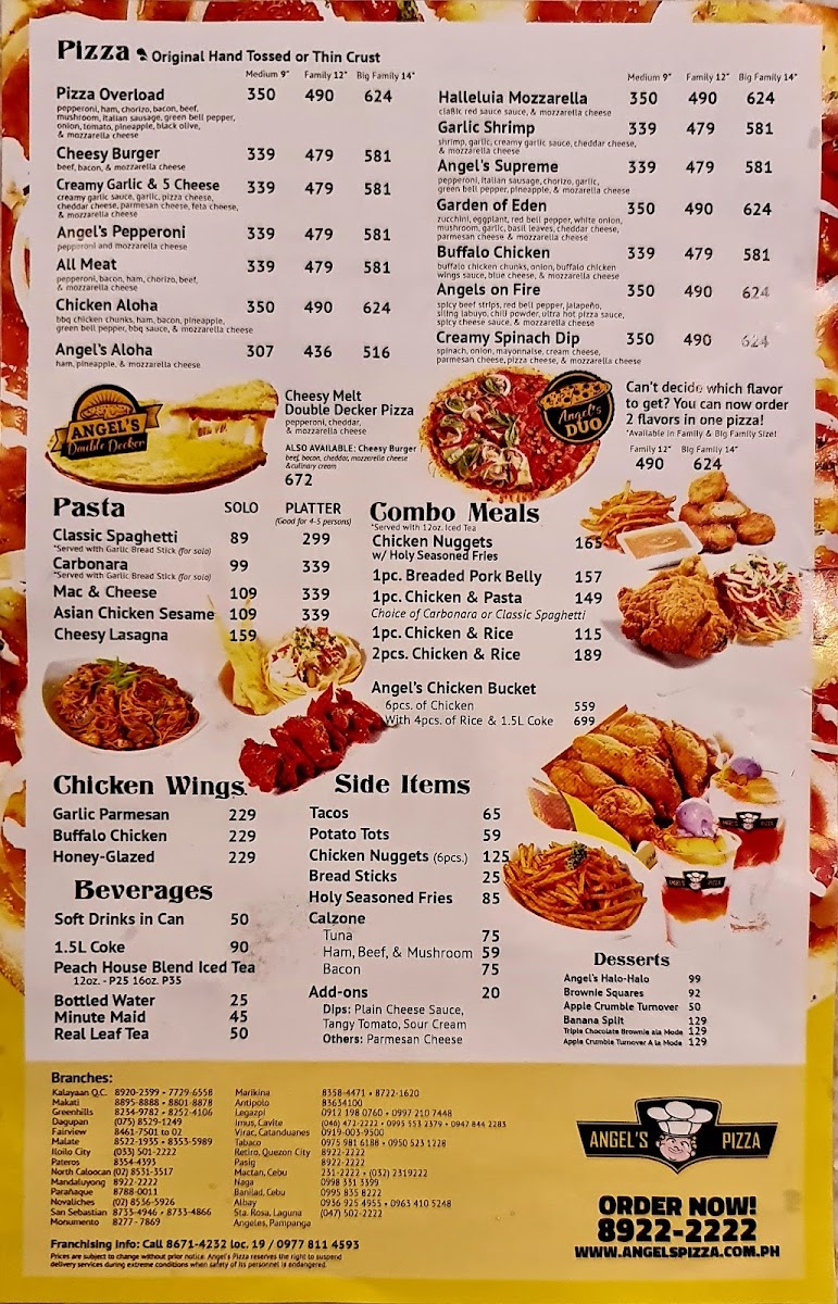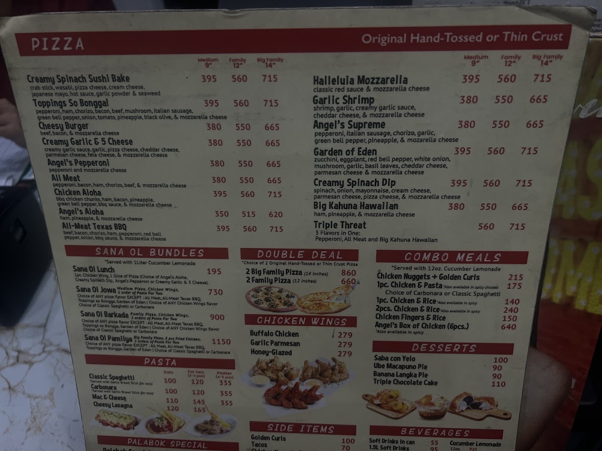 The menu at Angel's Pizza - Malate offers a diverse selection of dishes, catering to various tastes and preferences. Their Rice Angel Extra options include flavorful dishes like Three Cup Chicken, Sweet & Sour Pork, Sweet & Sour Chicken, Salt & Pepper Spareribs, and the hearty Big Tien Siomai. For those with a sweet tooth, the dessert selection features Banana Langka Pie, Saba Con Yelo, and a rich Triple Chocolate Cake. Pasta lovers can choose from Solo, For 2, or Platter options, making it ideal for individuals or groups. The beverage menu boasts a variety of coffee choices, including the Caramel Macchiato - Anghel Kape (16 Oz), Spanish Latte - Anghel Kape (1.5L), and Palm Sugar Latte - Anghel Kape. Meal deals like Meal Deal 1, Meal Deal 2, and Meal Deal 3 offer a budget-friendly way to enjoy a fulfilling meal. Side items such as Golden Curls, Plain Rice, Chicken Nuggets, Bread Sticks, and Chicken Fingers complement the main courses. The pizza selection includes both regular and family-sized options, like the Big Family (14 Inches) and Family (12 Inches) pizzas. The Angel's Box of Chicken serves up 6 pieces of Spicy Chicken, perfect for those craving a little heat. Combo meals like the Chicken with Pasta & Golden Curls Combo Meal and the Chicken Fingers with Rice Angels Chicken Bucket Combo Meal offer a great mix of flavors. For those looking for variety, the Triple Deal and Sana Ol Sulit Combo bundles are perfect for sharing with friends or family. Whether you’re in the mood for pizza, wings, or something more adventurous, Angel's Pizza - Malate delivers an array of choices that promise to satisfy every craving.